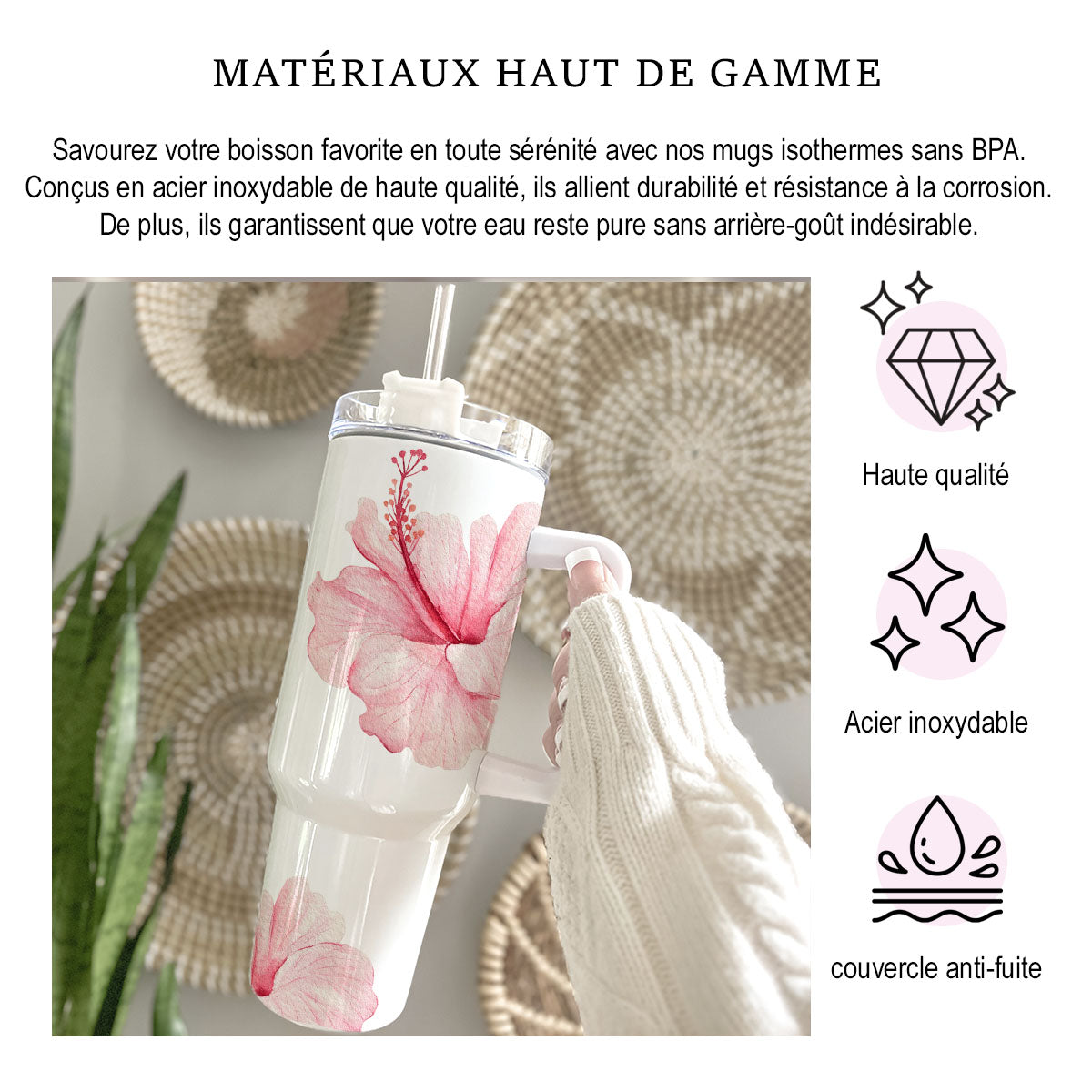 Apportez une touche tropicale et élégante à vos pauses café avec le mug isotherme Hibis, créé et confectionné par Emano. Inspiré par la beauté des hibiscus de Nouvelle-Calédonie, ce mug au style Stanley allie design raffiné et praticité au quotidien.